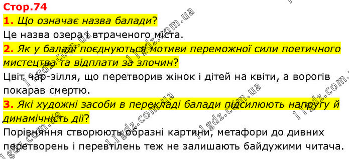 1. Що означає назва балади? Це назва озера і втраченого міста. 2. Як у баладі поєднуються мотиви переможної сили поетичного мистецтва та відплати за злочин? Цвіт чар-зілля, що перетворив жінок і дітей на квіти, а ворогів покарав смертю. 3. Які художні засоби в перекладі балади підсилюють напругу й динамічність дії? Порівняння створюють образні картини, метафори до дивних перетворень і перевтілень теж не залишають байдужими читача.
