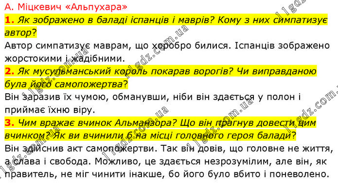 А. Міцкевич «Альпухара» 1. Як зображено в баладі іспанців і маврів? Кому з них симпатизує автор? Автор симпатизує маврам, що хоробро билися. Іспанців зображено жорстокими і жадібними. 2. Як мусульманський король покарав ворогів? Чи виправданою була його самопожертва? Він заразив їх чумою, обманувши, ніби він здається у полон і приймає їхню віру. 3. Чим вражає вчинок Альманзора? Що він прагнув довести цим вчинком? Як ви вчинили б на місці головного героя балади? Він здійснив акт самопожертви. Так він довів, що головне не життя, а слава і свобода. Можливо, це здається незрозумілим, але він, як правитель, не міг чинити інакше, бо його було вбито і поневолено.