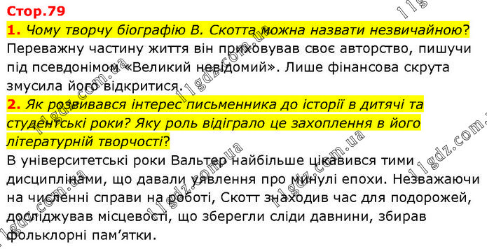 1. Чому творчу біографію В. Скотта можна назвати незвичайною? Переважну частину життя він приховував своє авторство, пишучи під псевдонімом «Великий невідомий». Лише фінансова скрута змусила його відкритися. 2. Як розвивався інтерес письменника до історії в дитячі та студентські роки? Яку роль відіграло це захоплення в його літературній творчості? В університетські роки Вальтер найбільше цікавився тими дисциплінами, що давали уявлення про минулі епохи. Незважаючи на численні справи на роботі, Скотт знаходив час для подорожей, досліджував місцевості, що зберегли сліди давнини, збирав фольклорні пам’ятки.