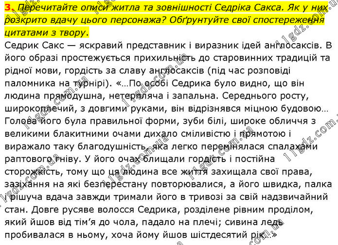 Перечитайте описи житла та зовнішності Седріка Сакса. Як у них розкрито вдачу цього персонажа? Обґрунтуйте свої спостереження цитатами з твору. Седрик Сакс — яскравий представник і виразник ідей англосаксів. В його образі простежується прихильність до старовинних традицій та рідної мови, гордість за славу англосаксів (під час розповіді паломника на турнірі). «…По особі Седрика було видно, що він людина прямодушна, нетерпляча і запальна. Середнього росту, широкоплечий, з довгими руками, він відрізнявся міцною будовою… Голова його була правильної форми, зуби білі, широке обличчя з великими блакитними очами дихало сміливістю і прямотою і виражало таку благодушність, яка легко перемінялася спалахами раптового гніву. У його очах блищали гордість і постійна сторожкість, тому що ця людина все життя захищала свої права, зазіхання на які безперестану повторювалися, а його швидка, палка і рішуча вдача завжди тримали його в тривозі за свій надзвичайний стан. Довге русяве волосся Седрика, розділене рівним проділом, який йшов від тім’я до чола, падало на плечі; сивина ледь пробивалася в ньому, хоча йому йшов шістдесятий рік…»