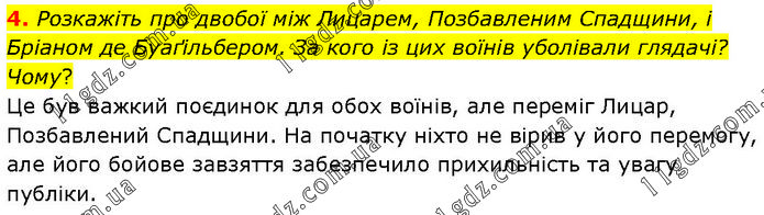 Розкажіть про двобої між Лицарем, Позбавленим Спадщини, і Бріаном де Буаґільбером. За кого із цих воїнів уболівали глядачі? Чому? Це був важкий поєдинок для обох воїнів, але переміг Лицар, Позбавлений Спадщини. На початку ніхто не вірив у його перемогу, але його бойове завзяття забезпечило прихильність та увагу публіки.