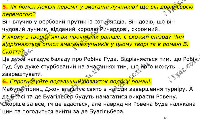 5. Як йомен Локслі переміг у змаганні лучників? Що він довів своєю перемогою? Він влучив у вербовий прутик із сотні ярдів. Він довів, що він чудовий лучник, відданий королю Ричардові, скромний. У якому з творів, які ви прочитали раніше, є схожий епізод? Чим відрізняються описи змагань лучників у цьому творі та в романі В. Скотта? Це дуже нагадує баладу про Робіна Гуда. Відрізняється тим, що Робін Гуд був дуже стурбований на змаганнях тим, що його можуть заарештувати. 6. Спрогнозуйте подальший розвиток подій у романі. Мабуть, принц Джон влаштує свято з нагоди завершення турніру. А де Брасі та де Буагільбер будуть намагатися викрасти Ровену. Скоріше за все, їм це вдасться, але навряд чи Ровена буде налякана цим та погодиться вийти за де Буагільбера.