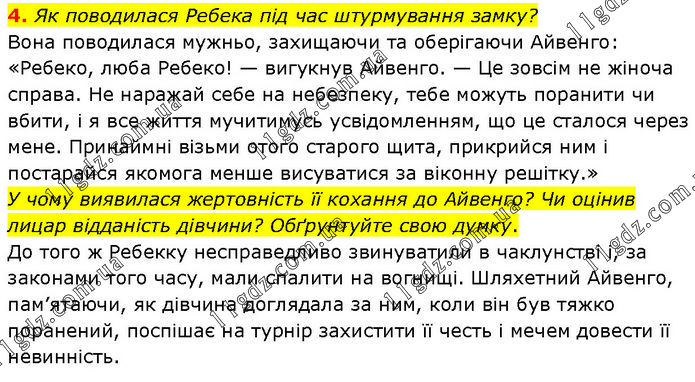 Як поводилася Ребека під час штурмування замку? Вона поводилася мужньо, захищаючи та оберігаючи Айвенго: «Ребеко, люба Ребеко! — вигукнув Айвенго. — Це зовсім не жіноча справа. Не наражай себе на небезпеку, тебе можуть поранити чи вбити, і я все життя мучитимусь усвідомленням, що це сталося через мене. Принаймні візьми отого старого щита, прикрийся ним і постарайся якомога менше висуватися за віконну решітку.» У чому виявилася жертовність її кохання до Айвенго? Чи оцінив лицар відданість дівчини? Обґрунтуйте свою думку. До того ж Ребекку несправедливо звинуватили в чаклунстві і, за законами того часу, мали спалити на вогнищі. Шляхетний Айвенго, пам’ятаючи, як дівчина доглядала за ним, коли він був тяжко поранений, поспішає на турнір захистити її честь і мечем довести її невинність.