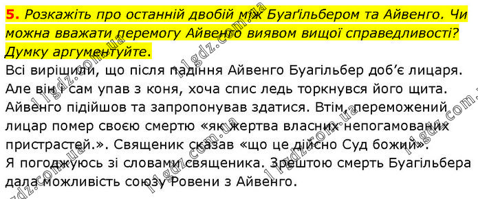 Розкажіть про останній двобій між Буаґільбером та Айвенго. Чи можна вважати перемогу Айвенго виявом вищої справедливості? Думку аргументуйте. Всі вирішили, що після падіння Айвенго Буагільбер доб’є лицаря. Але він і сам упав з коня, хоча спис ледь торкнувся його щита. Айвенго підійшов та запропонував здатися. Втім, переможений лицар помер своєю смертю «як жертва власних непогамованих пристрастей.». Священик сказав «що це дійсно Суд божий». Я погоджуюсь зі словами священика. Зрештою смерть Буагільбера дала можливість союзу Ровени з Айвенго.