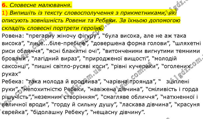 Словесне малювання. 1) Випишіть із тексту словосполучення з прикметниками, які описують зовнішність Ровени та Ребеки. За їхньою допомогою складіть словесні портрети героїнь. Ровена: “прегарну жіночу фігуру”, “була висока, але не аж така висока”, “лице...біле-пребіле”, “довершена форма голови”, “шляхетні риси обличчя”, “ясні блакитні очі”, “витонченими вигнутими темними бровами”, “лагідний вираз”, “природженої вищості”, “молодій саксонці”, “пишні світло-русяві коси”, “рівні кучерики”, “оголених руках” Ребека: “така молода й вродлива”, “чарівна троянда”, “ зціплені руки”, “непохитністю Ребеки, “навіжена дівчина”, “сміливість і горда рішучість”,”неземним створінням”, “смагляве обличчя”, “натхненної і величної вроди”, “горду й сильну душу”, “ласкава дівчина”, “красуня єврейка”, “бідолашну Ребеку”, “нещасну дівчину”.