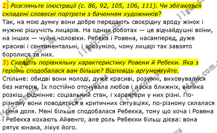 2) Розгляньте ілюстрації (с. 86, 92, 105, 106, 111). Чи збігаються складені словесні портрети з баченням художників? Так, на мою думку вони добре передають своєрідну вроду жінок і мужню рішучість лицарів. На одних роботах — це відчайдушні воїни, на інших — чуйні чоловіки. Ребека і Ровена, насамперед, дуже красиві і сентиментальні, і зрозуміло, чому лицарі так завзято боролися за них. 3) Складіть порівняльну характеристику Ровени й Ребеки. Яка з героїнь сподобалася вам більше? Відповідь аргументуйте. Спільне: обидві вони молоді, дуже красиві, розумні, виховувалися без матерів. Їх постійно оточувала любов і ласка ближніх, велика розкіш. Відмінне: соціальний стан, і характери у них різні. По-різному вони поводяться в критичних ситуаціях, по-різному склалася і їхня доля. Мені більше сподобалася Ребекка, тому що хоча і Ровена і Ребекка кохають Айвенго, але роль Ребекки більш дієва: вона рятує юнака, лікує його.