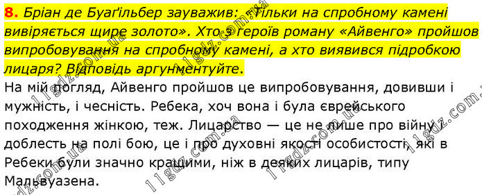 Бріан де Буаґільбер зауважив: «Тільки на спробному камені вивіряється щире золото». Хто з героїв роману «Айвенго» пройшов випробовування на спробному камені, а хто виявився підробкою лицаря? Відповідь аргунментуйте. На мій погляд, Айвенго пройшов це випробовування, довивши і мужність, і чесність. Ребека, хоч вона і була єврейського походження жінкою, теж. Лицарство — це не лише про війну і доблесть на полі бою, це і про духовні якості особистості, які в Ребеки були значно кращими, ніж в деяких лицарів, типу Мальвуазена.