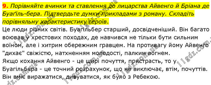 Порівняйте вчинки та ставлення до лицарства Айвенго й Бріана де Буаґіль-бера. Підтвердьте думки прикладами з роману. Складіть порівняльну характеристику героїв. Це люди різних світів. Буагільбер старший, досвідченіший. Він багато воював у хрестових походах, де навчився не тільки бути сильним воїном, але і хитрим обережним гравцем. На противагу йому Айвенго "дихає" свіжістю, натхненням молодості, палким вогнем. Якщо кохання Айвенго - це щирі почуття, пристрасть, то у Буагільбера - це точний розрахунок, що не виключає, втім, почуттів. Він вміє виражатися, дивуватися, як було з Ребекою.