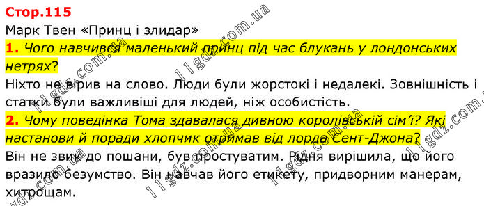 Марк Твен «Принц і злидар» 1. Чого навчився маленький принц під час блукань у лондонських нетрях? Ніхто не вірив на слово. Люди були жорстокі і недалекі. Зовнішність і статки були важливіші для людей, ніж особистість. 2. Чому поведінка Тома здавалася дивною королівській сім’ї? Які настанови й поради хлопчик отримав від лорда Сент-Джона? Він не звик до пошани, був простуватим. Рідня вирішила, що його вразило безумство. Він навчав його етикету, придворним манерам, хитрощам.