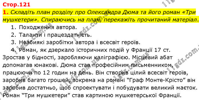 Складіть план розділу про Олександра Дюма та його роман «Три мушкетери». Спираючись на план, перекажіть прочитаний матеріал. 1. Походження автора. 2. Таланти і працездатність. 3. Неабиякі заробітки автора і всесвіт героїв. 4. Роман, як дзеркало історичних подій у Франції 17 ст. Зростав у бідності, заробляючи каліграфією. Місцевий абат допомагав юнакові. Дюма став професійним письменником, працюючи по 12 годин на день. Він створив цілий всесвіт героїв, заробив багато грошей, зокрема на романі “Граф Монте-Крісто” він заробив достатньо, щоб спроектувати і побудувати великий маєток. Роман “Три мушкетери” став картиною мушкетерської Франції.