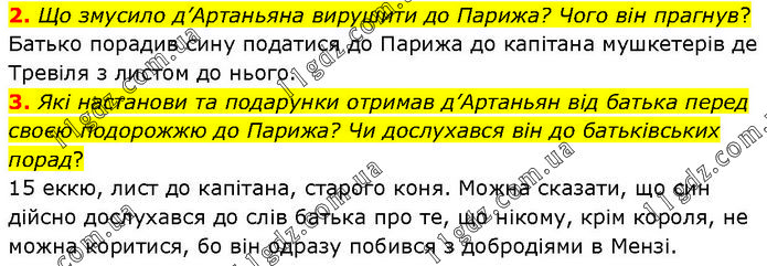 2. Що змусило д’Артаньяна вирушити до Парижа? Чого він прагнув? Батько порадив сину податися до Парижа до капітана мушкетерів де Тревіля з листом до нього. 3. Які настанови та подарунки отримав д’Артаньян від батька перед своєю подорожжю до Парижа? Чи дослухався він до батьківських порад? 15 еккю, лист до капітана, старого коня. Можна сказати, що син дійсно дослухався до слів батька про те, що нікому, крім короля, не можна коритися, бо він одразу побився з добродіями в Мензі.