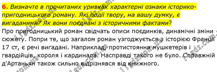 Визначте в прочитаних уривках характерні ознаки історико-пригодницького роману. Які події твору, на вашу думку, є вигаданими? Як вони поєднані з історичними фактами? Про пригодницький роман свідчать описи поєдинків, динамічні зміни сюжету. Попри те, що загалом роман узгоджується з історією Франції 17 ст, є речі вигадані. Наприклад, протистояння мушкетерів і гвардійців, короля і кардинала. Насправді такого не було. Справжній д'Артаньян також сильно відрізнявся від книжного.