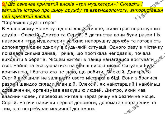 Що означає крилатий вислів «три мушкетери»? Складіть і запишіть історію про щиру дружбу та взаємодопомогу, використавши цей крилатий вислів. “Справжні друзі і герої” В маленькому містечку під назвою Затишне, жили троє нерозлучних друзів - Олексій, Дмитро та Сергій. З дитинства вони були разом і їх називали «три мушкетери» за їхню непорушну дружбу та готовність допомагати один одному в будь-якій ситуації. Одного разу в містечку почалася сильна злива, і річка, що протікала неподалік, почала виходити з берегів. Місцеві жителі в паніці намагалися врятувати своє майно та евакуюватися на більш високі місця. Ситуація була критичною, і багато хто не знав, що робити. Олексій, Дмитро та Сергій вирішили не залишати свого містечка в біді. Вони зібралися разом і швидко склали план дій. Олексій, як найстарший і найбільш досвідчений, організував евакуацію людей. Дмитро, який мав власний човен, перевозив жителів через річку на безпечне місце. Сергій, маючи навички першої допомоги, допомагав пораненим та тим, хто потребував медичної допомоги.