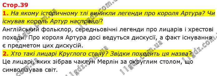 1. На якому історичному тлі виникли легенди про короля Артура? Чи існував король Артур насправді? Англійський фольклор, середньовічні легенди про лицарів і хрестові походи. Про короля Артура досі ведуться дискусії, а факт існування є предметом цих дискусій. 2. Хто такі лицарі Круглого столу? Звідки походить ця назва? Це лицарі, яких зібрав чаклун Мерлін за округлим столом, що символізував світ.
