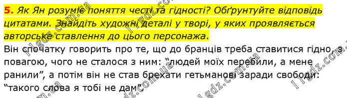 Як Ян розуміє поняття честі та гідності? Обґрунтуйте відповідь цитатами. Знайдіть художні деталі у творі, у яких проявляється авторське ставлення до цього персонажа. Він спочатку говорить про те, що до бранців треба ставитися гідно, з повагою, чого не сталося з ним: “людей моїх перебили, а мене ранили”, а потім він не став брехати гетьманові заради свободи: “такого слова я тобі не дам”.