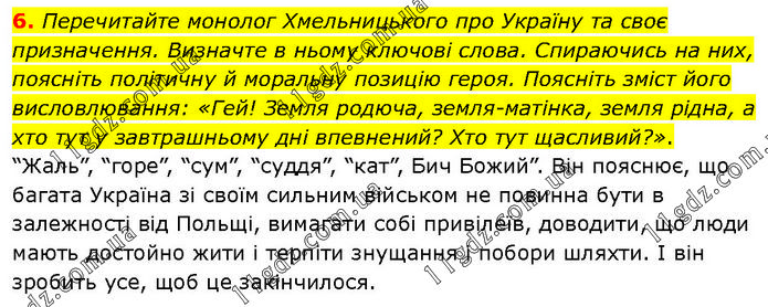 Перечитайте монолог Хмельницького про Україну та своє призначення. Визначте в ньому ключові слова. Спираючись на них, поясніть політичну й моральну позицію героя. Поясніть зміст його висловлювання: «Гей! Земля родюча, земля-матінка, земля рідна, а хто тут у завтрашньому дні впевнений? Хто тут щасливий?». “Жаль”, “горе”, “сум”, “суддя”, “кат”, Бич Божий”. Він пояснює, що багата Україна зі своїм сильним військом не повинна бути в залежності від Польщі, вимагати собі привілеїв, доводити, що люди мають достойно жити і терпіти знущання і побори шляхти. І він зробить усе, щоб це закінчилося.