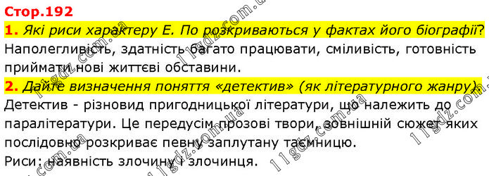 1. Які риси характеру Е. По розкриваються у фактах його біографії? Наполегливість, здатність багато працювати, сміливість, готовність приймати нові життєві обставини. 2. Дайте визначення поняття «детектив» (як літературного жанру). Детектив – різновид пригодницької літератури, що належить до паралітератури. Це передусім прозові твори, зовнішній сюжет яких послідовно розкриває певну заплутану таємницю. Риси: наявність злочину і злочинця.