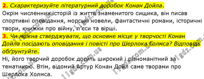 2. Схарактеризуйте літературний доробок Конан Дойла. Окрім численних історій із життя знаменитого сищика, він писав спортивні оповідання, морські новели, фантастичні романи, історичні твори, книжки про війну, п’єси та вірші. 3. Чи можна стверджувати, що основне місце у творчості Конан Дойла посідають оповідання і повісті про Шерлока Голмса? Відповідь обґрунтуйте. Ні, його творчий доробок досить широкий і різноманітний за тематикою. Втім, відомий Артур Конан Дойл саме творами про Шерлока Холмса.