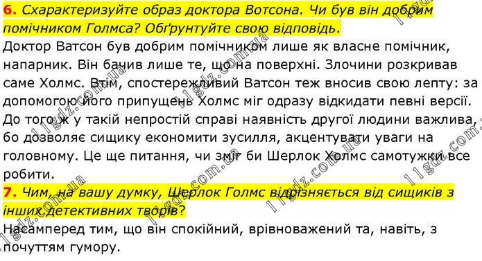 6. Схарактеризуйте образ доктора Вотсона. Чи був він добрим помічником Голмса? Обґрунтуйте свою відповідь. Доктор Ватсон був добрим помічником лише як власне помічник, напарник. Він бачив лише те, що на поверхні. Злочини розкривав саме Холмс. Втім, спостережливий Ватсон теж вносив свою лепту: за допомогою його припущень Холмс міг одразу відкидати певні версії. До того ж у такій непростій справі наявність другої людини важлива, бо дозволяє сищику економити зусилля, акцентувати уваги на головному. Це ще питання, чи зміг би Шерлок Холмс самотужки все робити. 7. Чим, на вашу думку, Шерлок Голмс відрізняється від сищиків з інших детективних творів? Насамперед тим, що він спокійний, врівноважений та, навіть, з почуттям гумору.