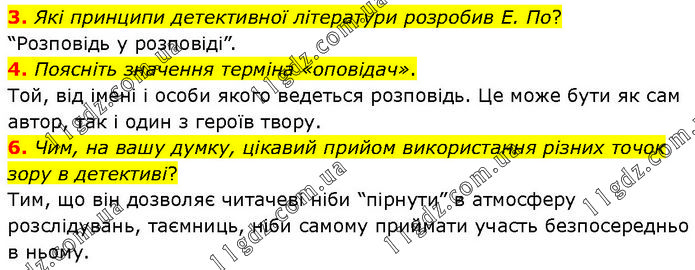 3. Які принципи детективної літератури розробив Е. По? “Розповідь у розповіді”. 4. Поясніть значення терміна «оповідач». Той, від імені і особи якого ведеться розповідь. Це може бути як сам автор, так і один з героїв твору. 6. Чим, на вашу думку, цікавий прийом використання різних точок зору в детективі? Тим, що він дозволяє читачеві ніби “пірнути” в атмосферу розслідувань, таємниць, ніби самому приймати участь безпосередньо в ньому.