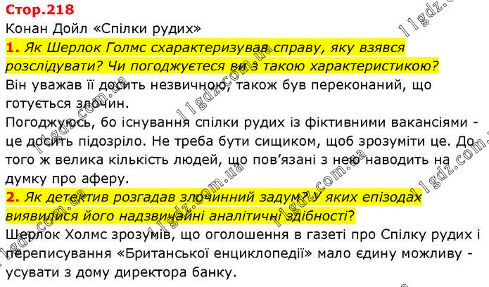 Конан Дойл «Спілки рудих» 1. Як Шерлок Голмс схарактеризував справу, яку взявся розслідувати? Чи погоджуєтеся ви з такою характеристикою? Він уважав її досить незвичною, також був переконаний, що готується злочин. Погоджуюсь, бо існування спілки рудих із фіктивними вакансіями – це досить підозріло. Не треба бути сищиком, щоб зрозуміти це. До того ж велика кількість людей, що пов’язані з нею наводить на думку про аферу. 2. Як детектив розгадав злочинний задум? У яких епізодах виявилися його надзвичайні аналітичні здібності? Шерлок Холмс зрозумів, що оголошення в газеті про Спілку рудих і переписування «Британської енциклопедії» мало єдину можливу – усувати з дому директора банку.