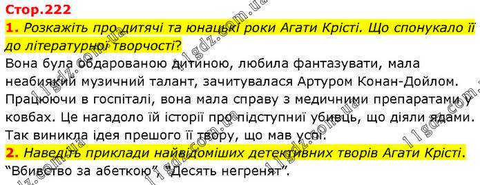 1. Розкажіть про дитячі та юнацькі роки Агати Крісті. Що спонукало її до літературної творчості? Вона була обдарованою дитиною, любила фантазувати, мала неабиякий музичний талант, зачитувалася Артуром Конан–Дойлом. Працюючи в госпіталі, вона мала справу з медичними препаратами у ковбах. Це нагадоло їй історії про підступниї убивць, що діяли ядами. Так виникла ідея прешого її твору, що мав успі. 2. Наведіть приклади найвідоміших детективних творів Агати Крісті. “Вбивство за абеткою”, “Десять негренят”.