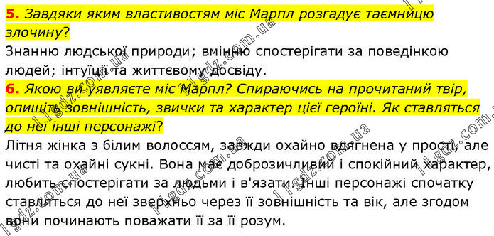 5. Завдяки яким властивостям міс Марпл розгадує таємницю злочину? Знанню людської природи; вмінню спостерігати за поведінкою людей; інтуїції та життєвому досвіду. 6. Якою ви уявляєте міс Марпл? Спираючись на прочитаний твір, опишіть зовнішність, звички та характер цієї героїні. Як ставляться до неї інші персонажі? Літня жінка з білим волоссям, завжди охайно вдягнена у прості, але чисті та охайні сукні. Вона має доброзичливий і спокійний характер, любить спостерігати за людьми і в'язати. Інші персонажі спочатку ставляться до неї зверхньо через її зовнішність та вік, але згодом вони починають поважати її за її розум.