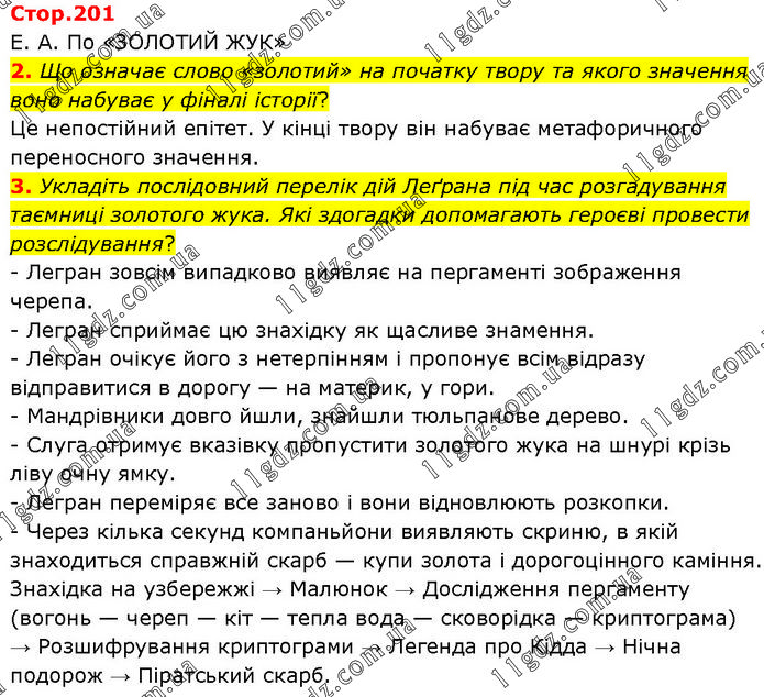 Е. А. По «ЗОЛОТИЙ ЖУК» 2. Що означає слово «золотий» на початку твору та якого значення воно набуває у фіналі історії? Це непостійний епітет. У кінці твору він набуває метафоричного переносного значення. 3. Укладіть послідовний перелік дій Леґрана під час розгадування таємниці золотого жука. Які здогадки допомагають героєві провести розслідування? – Легран зовсім випадково виявляє на пергаменті зображення черепа. – Легран сприймає цю знахідку як щасливе знамення. – Легран очікує його з нетерпінням і пропонує всім відразу відправитися в дорогу — на материк, у гори. – Мандрівники довго йшли, знайшли тюльпанове дерево. – Слуга отримує вказівку пропустити золотого жука на шнурі крізь ліву очну ямку. – Легран переміряє все заново і вони відновлюють розкопки. – Через кілька секунд компаньйони виявляють скриню, в якій знаходиться справжній скарб — купи золота і дорогоцінного каміння. Знахідка на узбережжі → Малюнок → Дослідження пергаменту (вогонь — череп — кіт — тепла вода — сковорідка — криптограма) → Розшифрування криптограми → Легенда про Кідда → Нічна подорож → Піратський скарб.