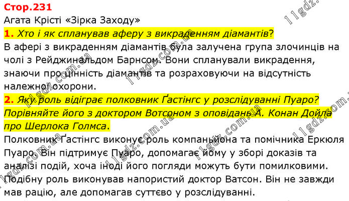 Агата Крісті «Зірка Заходу» 1. Хто і як спланував аферу з викраденням діамантів? В афері з викраденням діамантів була залучена група злочинців на чолі з Рейджинальдом Барнсом. Вони спланували викрадення, знаючи про цінність діамантів та розраховуючи на відсутність належної охорони. 2. Яку роль відіграє полковник Ґастінгс у розслідуванні Пуаро? Порівняйте його з доктором Вотсоном з оповідань А. Конан Дойла про Шерлока Голмса. Полковник Ґастінгс виконує роль компаньйона та помічника Еркюля Пуаро. Він підтримує Пуаро, допомагає йому у зборі доказів та аналізі подій, хоча іноді його погляди можуть бути помилковими. Подібну роль виконував напористий доктор Ватсон. Він не завжди мав рацію, але допомагав суттєво у розслідуванні.