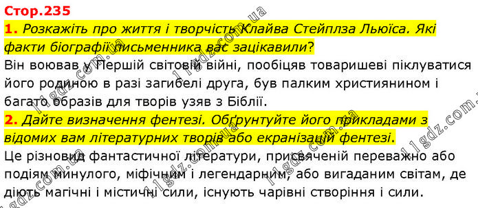 1. Розкажіть про життя і творчість Клайва Стейплза Льюїса. Які факти біографії письменника вас зацікавили? Він воював у Першій світовій війні, пообіцяв товаришеві піклуватися його родиною в разі загибелі друга, був палким християнином і багато образів для творів узяв з Біблії. 2. Дайте визначення фентезі. Обґрунтуйте його прикладами з відомих вам літературних творів або екранізацій фентезі. Це різновид фантастичної літератури, присвяченій переважно або подіям минулого, міфічним і легендарним, або вигаданим світам, де діють магічні і містичні сили, існують чарівні створіння і сили.
