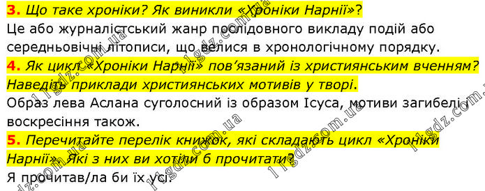 3. Що таке хроніки? Як виникли «Хроніки Нарнії»? Це або журналістський жанр послідовного викладу подій або середньовічні літописи, що велися в хронологічному порядку. 4. Як цикл «Хроніки Нарнії» пов’язаний із християнським вченням? Наведіть приклади християнських мотивів у творі. Образ лева Аслана суголосний із образом Ісуса, мотиви загибелі і воскресіння також. 5. Перечитайте перелік книжок, які складають цикл «Хроніки Нарнії». Які з них ви хотіли б прочитати? Я прочитав/ла би їх усі.