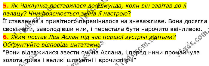 5. Як Чаклунка поставилася до Едмунда, коли він завітав до її палацу? Чим пояснюється зміна її настрою? Її ставлення з привітного перемінилося на зневажливе. Вона досягла своєї мети, заволодівши ним, і перестала бути нарочито ввічливою. 6. Яким постає Лев Аслан під час першої зустрічі з дітьми? Обґрунтуйте відповідь цитатами. “Вони відважилися звести очі на Аслана, і перед ними промайнула золота грива і великі шляхетні і врочисті очі”