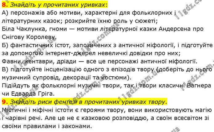 8. Знайдіть у прочитаних уривках: А) персонажів або мотиви, характерні для фольклорних і літературних казок; розкрийте їхню роль у сюжеті; Біла Чаклунка, гноми — мотиви літературної казки Андерсена про Снігову Королеву. Б) фантастичних істот, запозичених з античної міфології, і підготуйте за допомогою інтернет–джерел невеличкі довідки про них; Фавни, кентаври, дріади — все це персонажі античної міфології. В) підготуйте інсценізацію одного з епізодів твору (доберіть до нього музичний супровід, декорації та костюми). Підійдуть як фольклорні музичні твори, так і твори класичні Вагнера чи Едварда Гріга. 9. Знайдіть риси фентезі в прочитаних уривках твору. Містичні і міфічні істоти є героями твору, вони використовують магію і чарівні речі. Але це не є казковою розповіддю, а своїм всесвітом зі своїми правилами і законами.