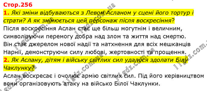 1. Які зміни відбуваються з Левом Асланом у сцені його тортур і страти? А як змінюється цей персонаж після воскресіння? Після воскресіння Аслан стає ще більш могутнім і величним, символізуючи перемогу добра над злом та життя над смертю. Він стає джерелом нової надії та натхнення для всіх мешканців Нарнії, демонструючи силу любові, жертовності та прощення. 2. Як Аслану, дітям і війську світлих сил удалося здолати Білу Чаклунку? Аслан воскресає і очолює армію світлих сил. Під його керівництвом вони організовують атаку на військо Білої Чаклунки.