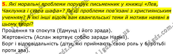 Які моральні проблеми порушує письменник у книжці «Лев, Чаклунка і стара шафа»? Як ці проблеми пов’язані з християнським ученням? А які інші відомі вам євангельські теми й мотиви наявні в цьому творі? Прощення та спокута (Едмунд і його зрада). Жертовність (Аслан жертвує собою заради Нарнії). Борг і відповідальність (діти, які приймають свою роль у боротьбі проти зла).