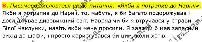 Письмово висловтеся щодо питання: «Якби я потрапив до Нарнії». Якби я потрапив до Нарнії, то, мабуть, я би багато подорожував і досліджував дивовижний світ. Навряд чи би я втручався у справи Білої Чаклунки, навіть якби мене просили. Я завжди б мав запасний вихід до шафи, і просто користувався би цим, коли хотів.