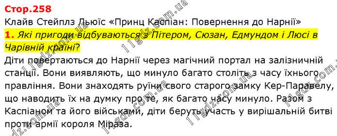 Клайв Стейплз Льюїс «Принц Каспіан: Повернення до Нарнії» 1. Які пригоди відбуваються з Пітером, Сюзан, Едмундом і Люсі в Чарівній країні? Діти повертаються до Нарнії через магічний портал на залізничній станції. Вони виявляють, що минуло багато століть з часу їхнього правління. Вони знаходять руїни свого старого замку Кер–Паравелу, що наводить їх на думку про те, як багато часу минуло. Разом з Каспіаном та його військами, діти беруть участь у вирішальній битві проти армії короля Міраза.
