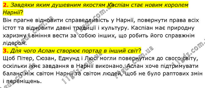 2. Завдяки яким душевним якостям Каспіан стає новим королем Нарнії? Він прагне відновити справедливість у Нарнії, повернути права всіх істот та відновити давні традиції і культуру. Каспіан має природну харизму і вміння вести за собою інших, що робить його справжнім лідером. 3. Для чого Аслан створює портал в інший світ? Щоб Пітер, Сюзан, Едмунд і Люсі могли повернутися до свого світу, оскільки їхнє завдання в Нарнії виконано. Аслан хоче підтримувати баланс між світом Нарнії та світом людей, щоб не було раптових змін і переміщень.