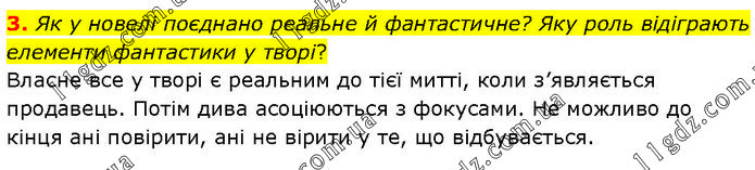 Як у новелі поєднано реальне й фантастичне? Яку роль відіграють елементи фантастики у творі? Власне все у творі є реальним до тієї митті, коли з’являється продавець. Потім дива асоціюються з фокусами. Не можливо до кінця ані повірити, ані не вірити у те, що відбувається.