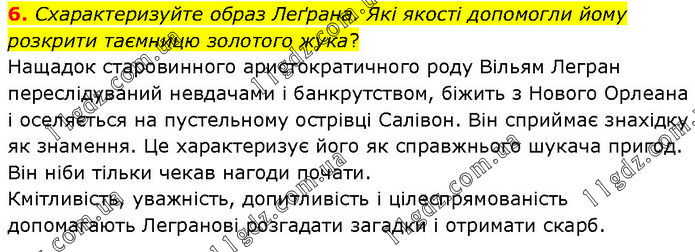 Схарактеризуйте образ Леґрана. Які якості допомогли йому розкрити таємницю золотого жука? Нащадок старовинного аристократичного роду Вільям Легран переслідуваний невдачами і банкрутством, біжить з Нового Орлеана і оселяється на пустельному острівці Салівон. Він сприймає знахідку як знамення. Це характеризує його як справжнього шукача пригод. Він ніби тільки чекав нагоди почати. Кмітливість, уважність, допитливість і цілеспрямованість допомагають Легранові розгадати загадки і отримати скарб.