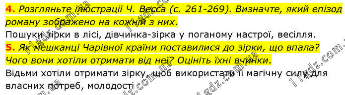 4. Розгляньте ілюстрації Ч. Весса (с. 261–269). Визначте, який епізод роману зображено на кожній з них. Пошуки зірки в лісі, дівчинка–зірка у поганому настрої, весілля. 5. Як мешканці Чарівної країни поставилися до зірки, що впала? Чого вони хотіли отримати від неї? Оцініть їхні вчинки. Відьми хотіли отримати зірку, щоб використати її магічну силу для власних потреб, молодості.