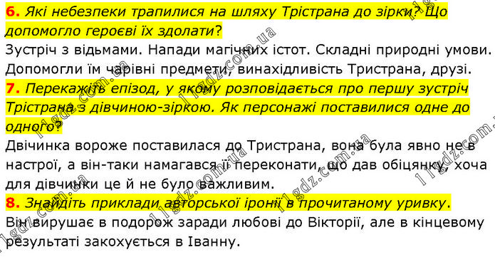 6. Які небезпеки трапилися на шляху Трістрана до зірки? Що допомогло героєві їх здолати? Зустріч з відьмами. Напади магічних істот. Складні природні умови. Допомогли їм чарівні предмети, винахідливість Тристрана, друзі. 7. Перекажіть епізод, у якому розповідається про першу зустріч Трістрана з дівчиною–зіркою. Як персонажі поставилися одне до одного? Двічинка вороже поставилася до Тристрана, вона була явно не в настрої, а він–таки намагався її переконати, що дав обіцянку, хоча для дівчинки це й не було важливим. 8. Знайдіть приклади авторської іронії в прочитаному уривку. Він вирушає в подорож заради любові до Вікторії, але в кінцевому результаті закохується в Іванну.