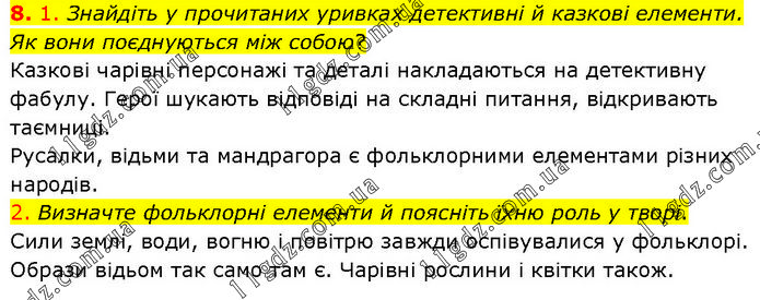 1. Знайдіть у прочитаних уривках детективні й казкові елементи. Як вони поєднуються між собою? Казкові чарівні персонажі та деталі накладаються на детективну фабулу. Герої шукають відповіді на складні питання, відкривають таємниці. Русалки, відьми та мандрагора є фольклорними елементами різних народів. 2. Визначте фольклорні елементи й поясніть їхню роль у творі. Сили землі, води, вогню і повітрю завжди оспівувалися у фольклорі. Образи відьом так само там є. Чарівні рослини і квітки також.