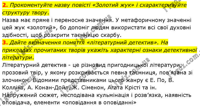 2. Прокоментуйте назву повісті «Золотий жук» і схарактеризуйте структуру твору. Назва має пряме і переносне значення. У метафоричному значенні цей жук «золотий», бо допоміг людям використати всі свої духовні здібності, щоб розкрити таємницю скарбу. 3. Дайте визначення поняття «літературний детектив». На прикладах прочитаних творів укажіть характерні ознаки детективної літератури. Літературний детектив – це різновид пригодницької літератури; прозовий твір, у якому розкривається певна таємниця, пов’язана зі злочином. Відомими представниками цього жанру є Е. По, В. Коллінз, А. Конан–Дойл, Ж. Сіменон, Агата Крісті та ін. Напружений сюжет, несподівана кульмінація і розв’язка, наявність оповідача, елементи «оповідання в оповіданні»