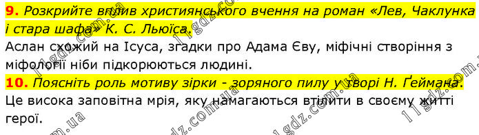 9. Розкрийте вплив християнського вчення на роман «Лев, Чаклунка і стара шафа» К. С. Льюїса. Аслан схожий на Ісуса, згадки про Адама Єву, міфічні створіння з міфології ніби підкорюються людині. 10. Поясніть роль мотиву зірки – зоряного пилу у творі Н. Ґеймана. Це висока заповітна мрія, яку намагаються втілити в своєму житті герої.