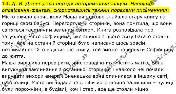 Д. В. Джонс дала поради авторам–початківцям. Напишіть оповідання–фентезі, скориставшись такими порадами письменниці: Місто ожило вночі, коли Маша випадково знайшла стару книгу на горищі своєї бабусі. Перегортуючи сторінки, вона помітила, що вони світяться таємничим зеленим світлом. Книга розповідала про загублене місто Софійщина, яке зникло з цього світу багато століть тому. Але на останній сторінці було написано щось зовсім незвичайне: "Хто відкриє цю книгу, той зможе повернути Софійщину до життя. Маша вирішила перевірити, чи справді книга містить магію. Вона вигукнула заклинання з останньої сторінки, і навколо неї почали вирувати вихори енергії. Зненацька вона опинилася в іншому світі, на околиці. Місто виглядало так, ніби його щойно залишили – вулиці були порожніми, а будівлі, хоч і старі, все ще стояли міцно.
