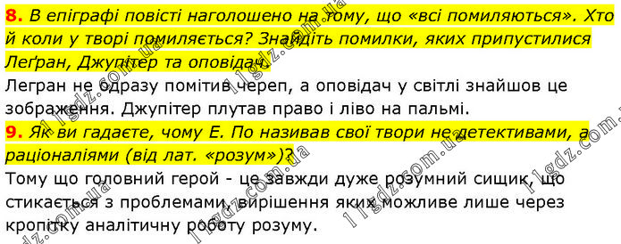 8. В епіграфі повісті наголошено на тому, що «всі помиляються». Хто й коли у творі помиляється? Знайдіть помилки, яких припустилися Леґран, Джупітер та оповідач. Легран не одразу помітив череп, а оповідач у світлі знайшов це зображення. Джупітер плутав право і ліво на пальмі. 9. Як ви гадаєте, чому Е. По називав свої твори не детективами, а раціоналіями (від лат. «розум»)? Тому що головний герой – це завжди дуже розумний сищик, що стикається з проблемами, вирішення яких можливе лише через кропітку аналітичну роботу розуму.