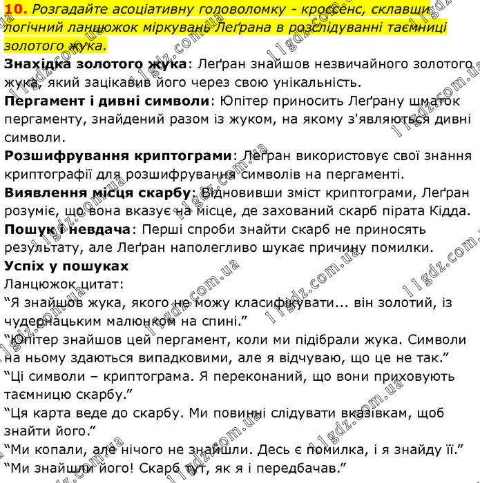 Розгадайте асоціативну головоломку – кроссенс, склавши логічний ланцюжок міркувань Леґрана в розслідуванні таємниці золотого жука. Знахідка золотого жука: Леґран знайшов незвичайного золотого жука, який зацікавив його через свою унікальність. Пергамент і дивні символи: Юпітер приносить Леґрану шматок пергаменту, знайдений разом із жуком, на якому з'являються дивні символи. Розшифрування криптограми: Леґран використовує свої знання криптографії для розшифрування символів на пергаменті. Виявлення місця скарбу: Відновивши зміст криптограми, Леґран розуміє, що вона вказує на місце, де захований скарб пірата Кідда. Пошук і невдача: Перші спроби знайти скарб не приносять результату, але Леґран наполегливо шукає причину помилки. Успіх у пошуках Ланцюжок цитат: “Я знайшов жука, якого не можу класифікувати... він золотий, із чудернацьким малюнком на спині.” “Юпітер знайшов цей пергамент, коли ми підібрали жука. Символи на ньому здаються випадковими, але я відчуваю, що це не так.” “Ці символи – криптограма. Я переконаний, що вони приховують таємницю скарбу.” “Ця карта веде до скарбу. Ми повинні слідувати вказівкам, щоб знайти його.” “Ми копали, але нічого не знайшли. Десь є помилка, і я знайду її.” “Ми знайшли його! Скарб тут, як я і передбачав.”