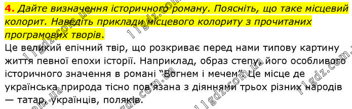 Дайте визначення історичного роману. Поясніть, що таке місцевий колорит. Наведіть приклади місцевого колориту з прочитаних програмових творів. Це великий епічний твір, що розкриває перед нами типову картину життя певної епохи історії. Наприклад, образ степу, його особливого історичного значення в романі “Вогнем і мечем”. Це місце де українська природа тісно пов'язана з діяннями трьох різних народів — татар, українців, поляків.
