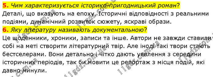 5. Чим характеризується історико–пригодницький роман? Деталі, що вказують на епоху. Історичні відповідності з реальними подіями, динамічний розвиток сюжету, яскраві образи. 6. Яку літературу називають документальною? Це щоденники, хроники, записи та інше. Автори не завжди ставили собі на меті створити літературний твір. Але іноді такі твори стають бестселерами. Вони детально і чітко дають уявлення з середини історичних періодів, так би мовити це репортаж з місця подій, які давно минули.